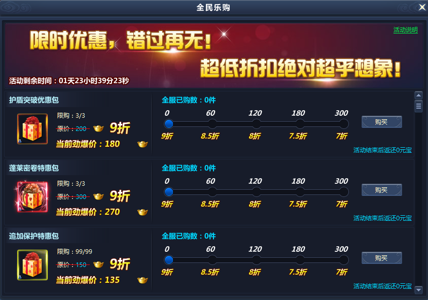 1、活动期间可参与购买低价珍贵道具,且拥有限购数量。
